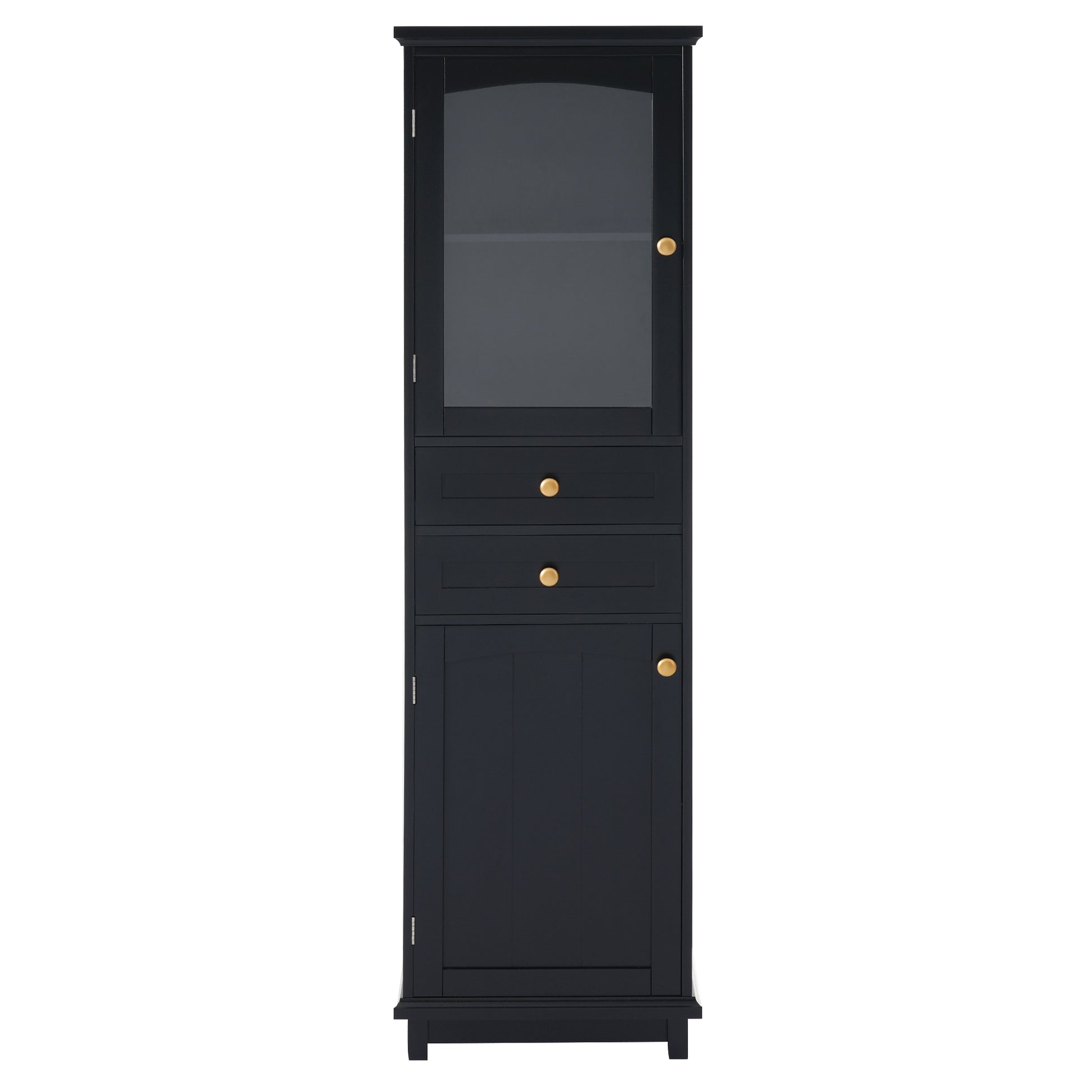 This tall bathroom cabinet combines sleek modern aesthetics with functional elegance. Featuring glass doors, a black painted finish, and gold round handles, it effortlessly adds a touch of sophistication to any bathroom decor. The clean lines and contemporary style make it a standout piece that enha
