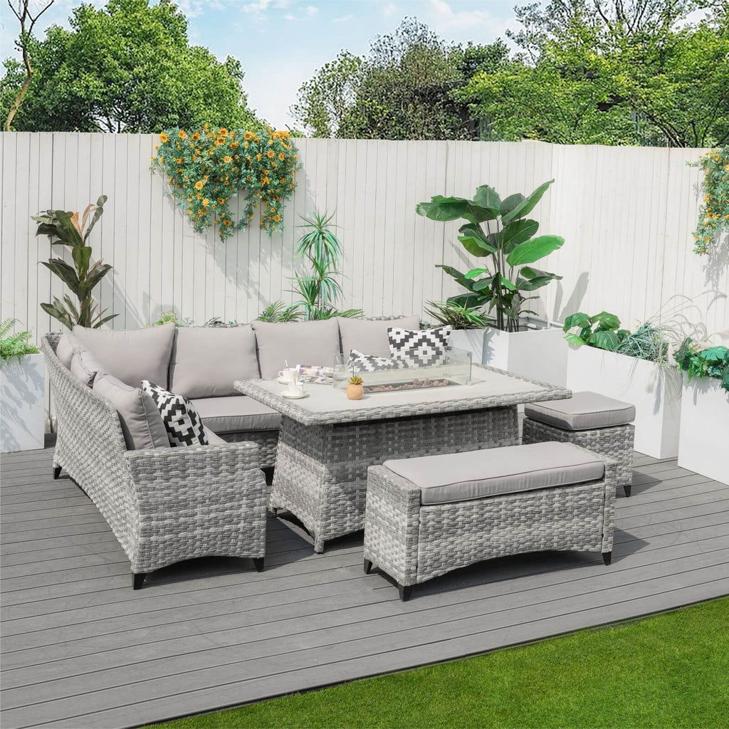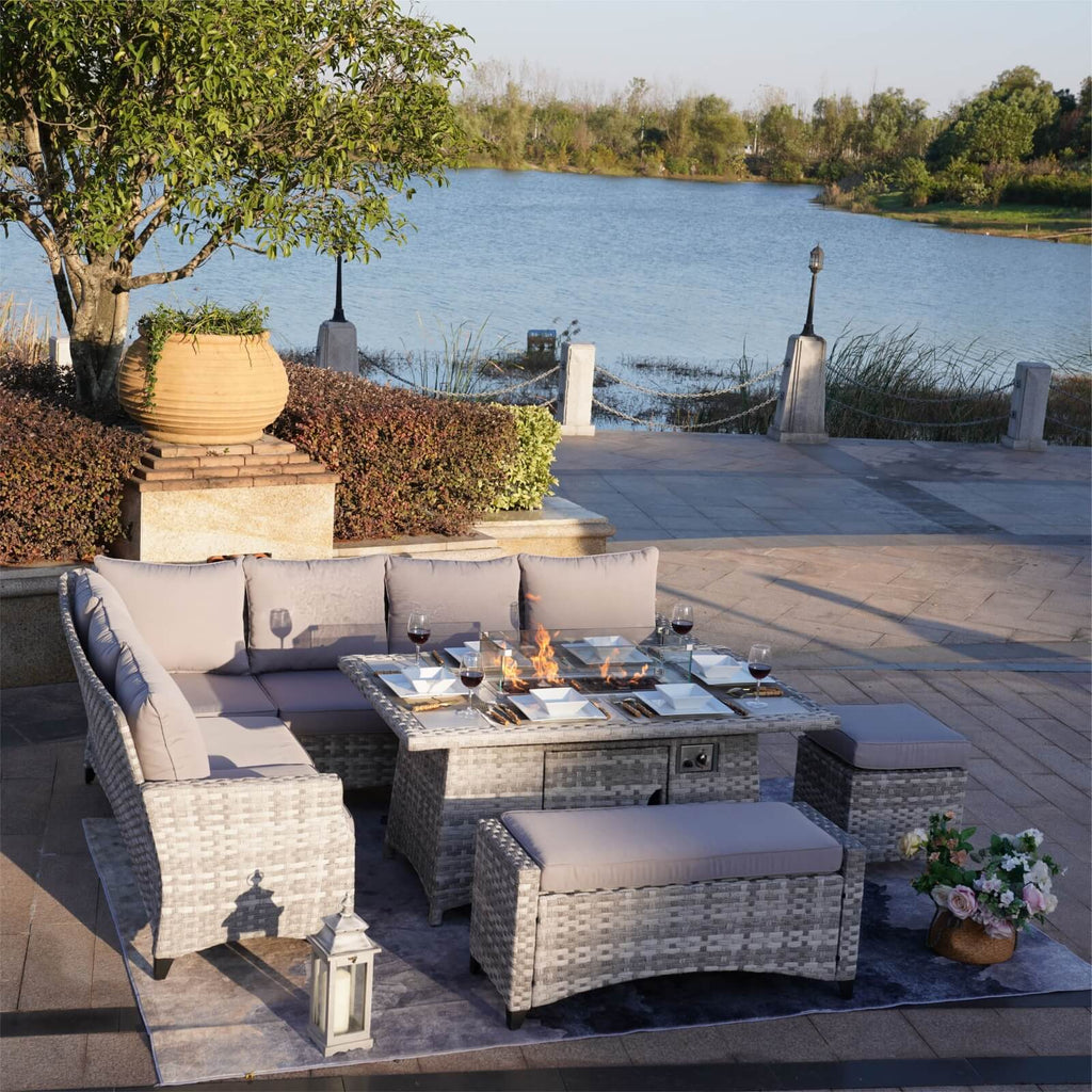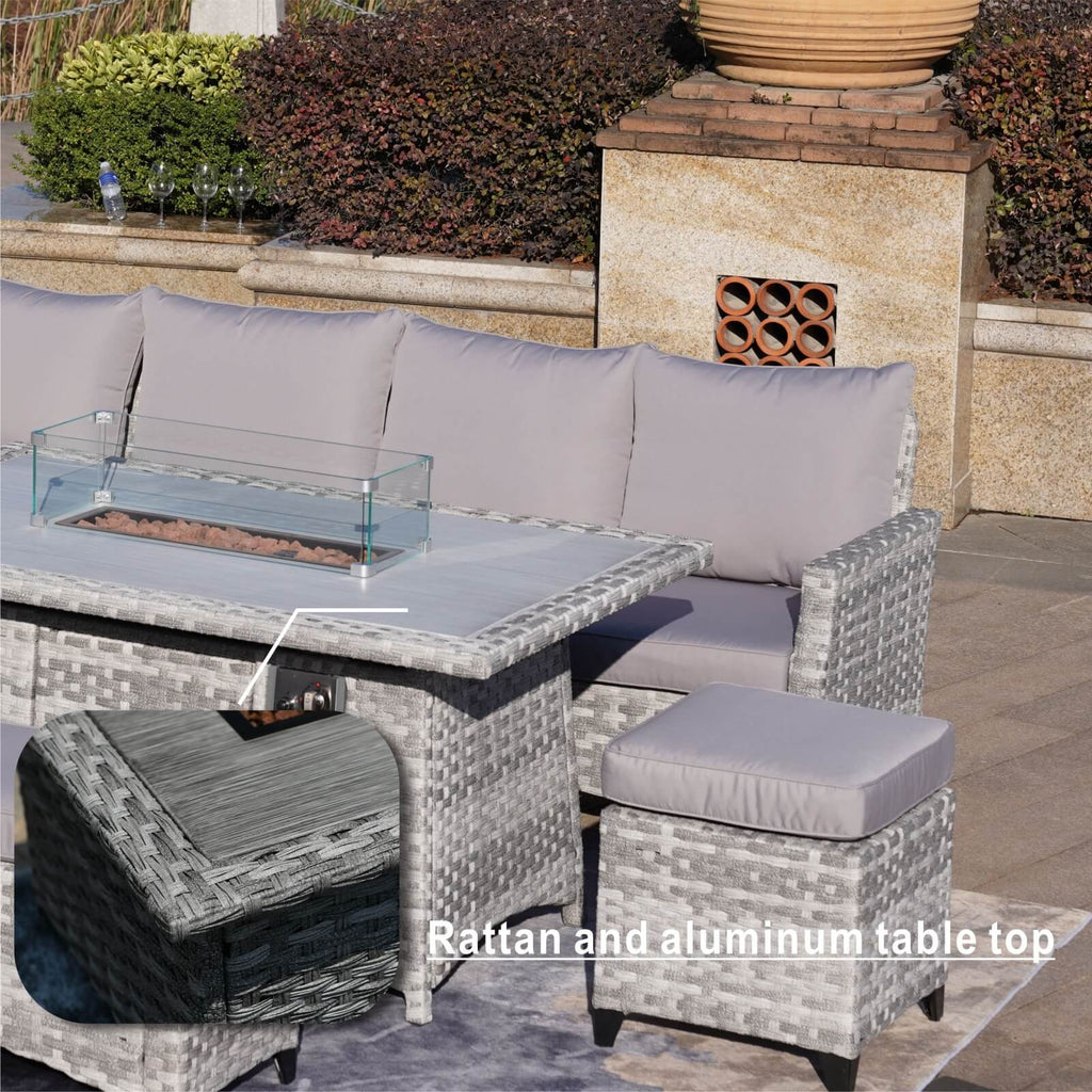 Bring new energy to your home and transform your patio into the ultimate space for relaxation and entertainment with this modern, streamlined outdoor conversational sofa set. Designed for comfort, durability, and style, this set features a sleek combination of aluminum and wicker elements. It includes one left-arm three-seat sofa, one right-arm three-seat sofa, a long bench, an ottoman, and a gas fire pit table. Perfect for any outdoor space, this set offers ample seating and warmth for cozy gatherings or peaceful moments outdoors.