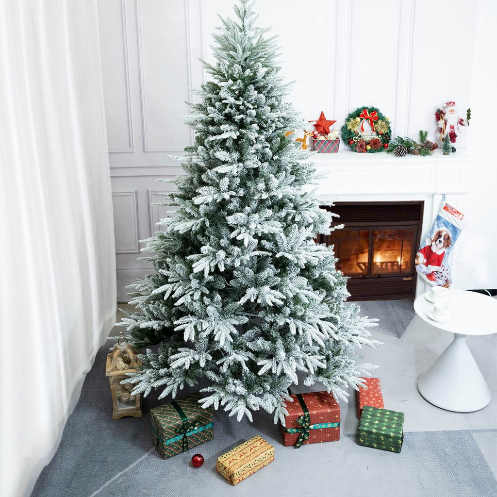 Create a snowy winter scene indoors with this elegant Christmas tree — the perfect centerpiece for a warm, festive, and unforgettable holiday season.