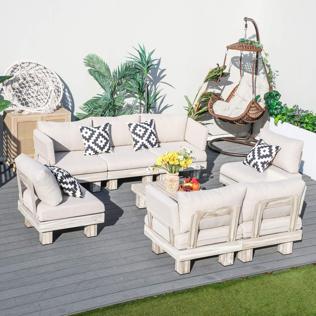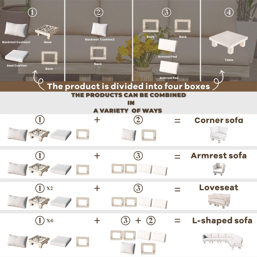 Transform your outdoor space with the 7-Seat Sofa Set, a perfect combination of modern style and outdoor functionality.Crafted from rust-proof aluminum and finished with a smooth, weather-resistant coating, the set offers long-lasting durability and a clean, contemporary look. The open-back sofa design adds a touch of elegance while enhancing airflow, and the plush, water-resistant cushions provide exceptional comfort and support.