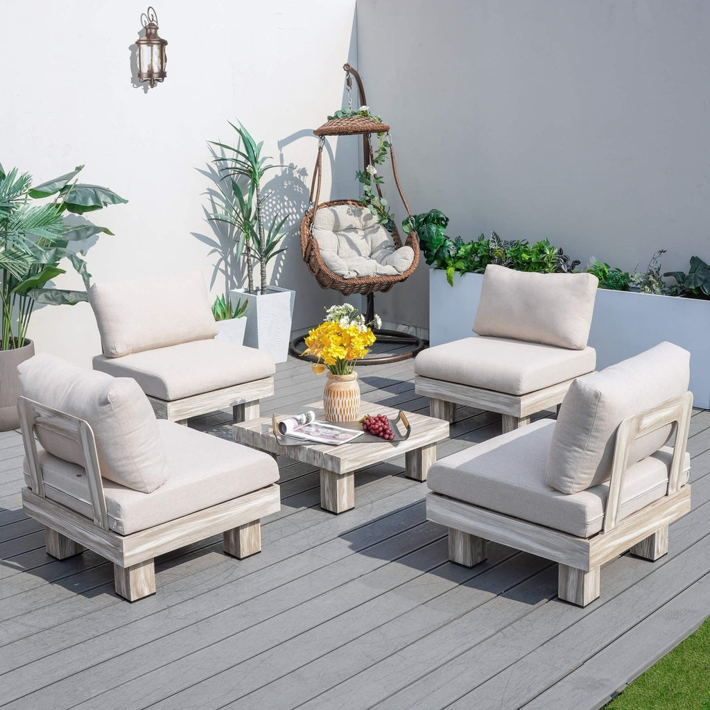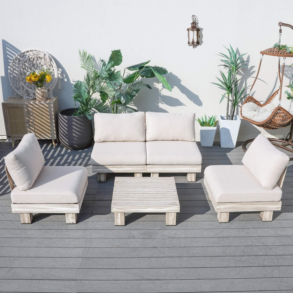 The Armless 4-Seat Patio Sofa Set is designed to bring style, comfort, and ultimate flexibility to your outdoor space. Featuring four armless single sofas and a matching coffee table, this set can be arranged in a variety of layouts—from a long 4-seat sofa to an L-shaped corner sofa—perfect for patios, poolside decks, or backyard gatherings.