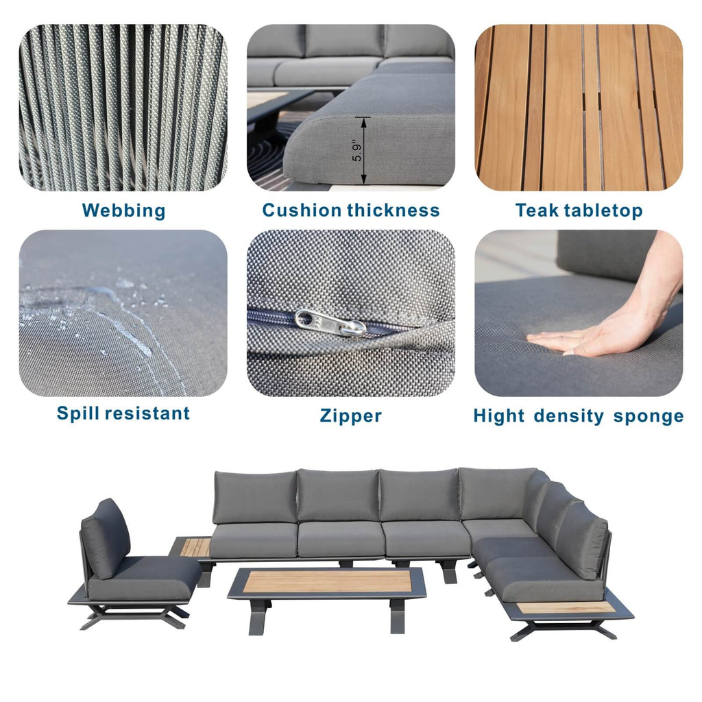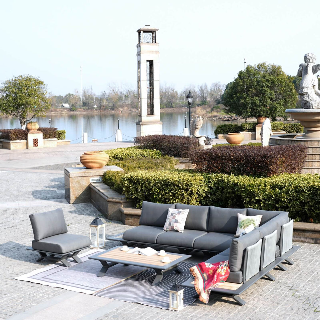 The Aluminum Dew Tube Sofa Set is designed to offer ultimate comfort and a modern aesthetic for your outdoor spaces. Featuring durable aluminum frames, teak accents, and high-quality cushions, this set combines functionality with elegance. Perfect for patios, gardens, or balconies, the modular design allows for flexibility and comfort for all your gatherings.