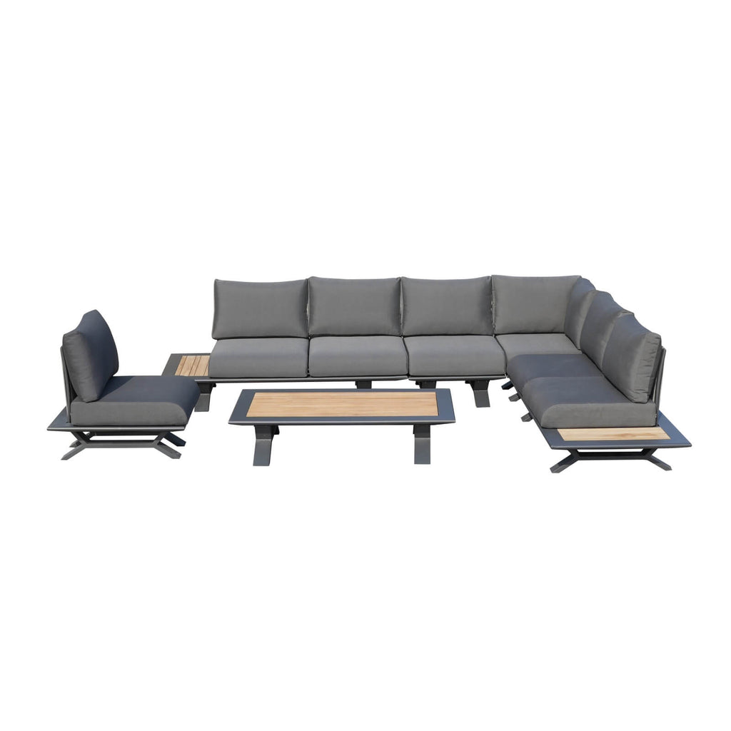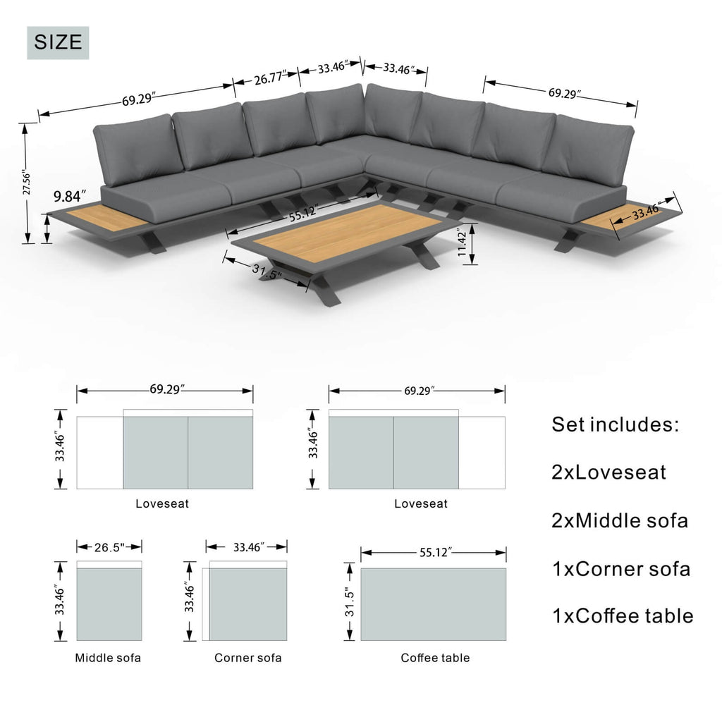 - Teak Inlays:The love seat and corner sofa are designed with built-in teak side tables, offering natural warmth and style. The matching coffee table features a premium FSC-certified teak top, adding a refined touch of luxury and sustainability.