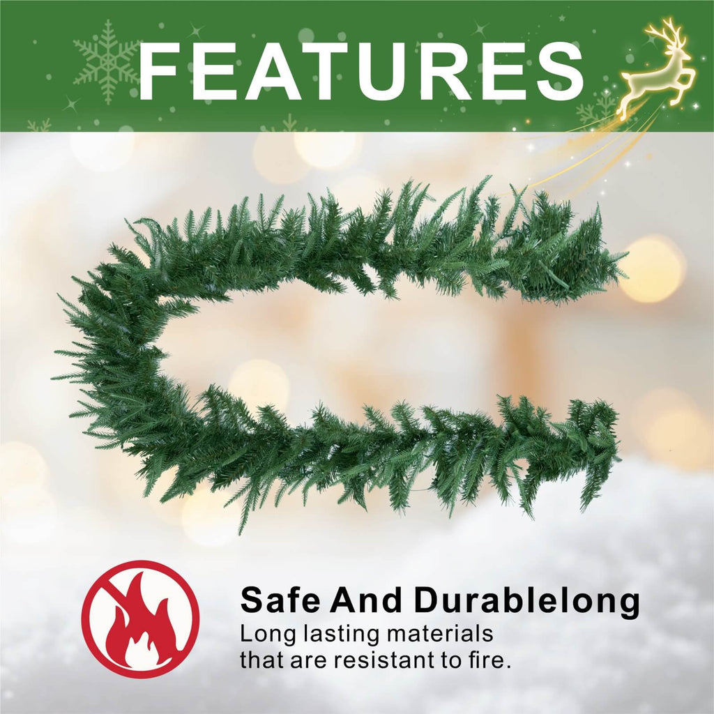 The pre-lit version features 50 warm white LED lights with a steady-on glow, powered by a 3×AA waterproof battery box with built-in timer, allowing safe and convenient display anywhere. The garland includes green wiring that blends seamlessly with the foliage for a clean, polished look.