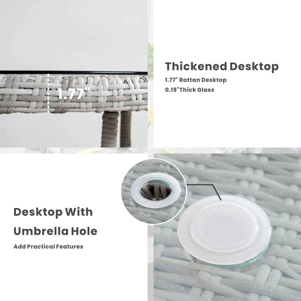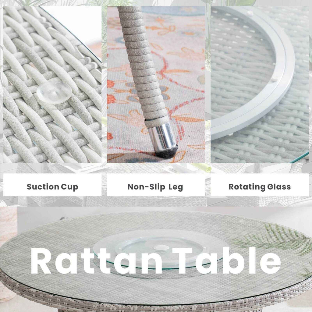 - Convenient Design:Features a built-in tempered glass Lazy Susan for effortless sharing during meals, along with a central umbrella hole that allows you to add shade and stay cool on sunny days—perfect for comfortable outdoor dining.