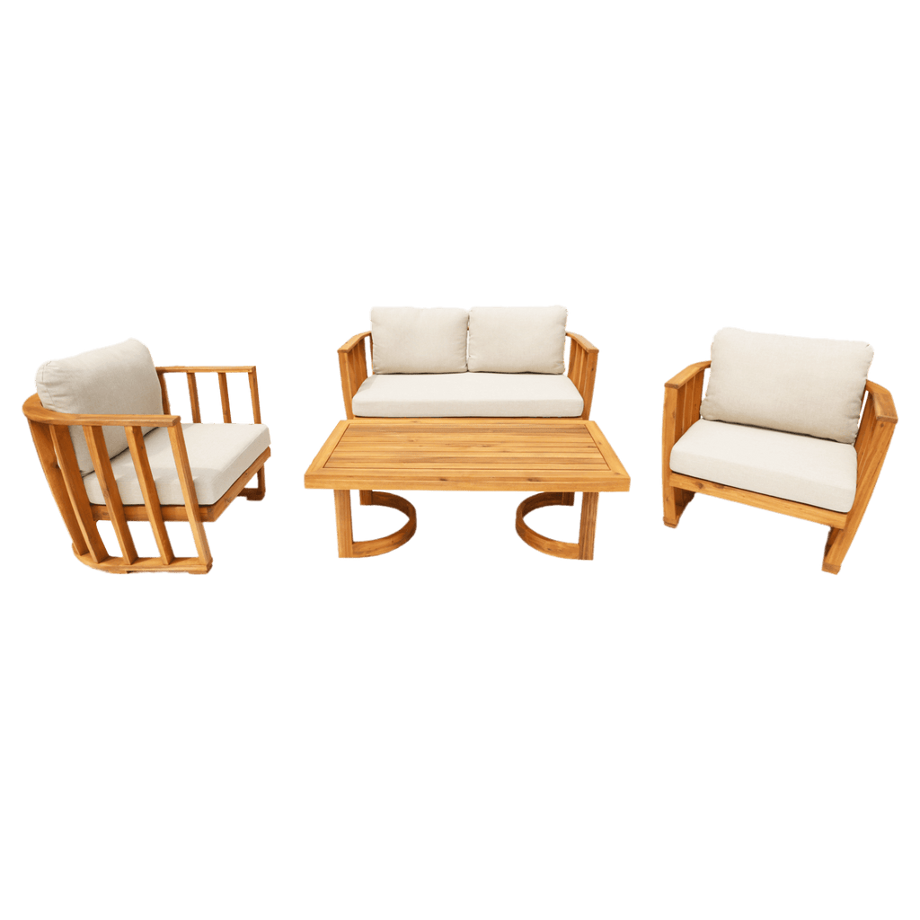 This versatile outdoor sofa set includes a 2-seater sofa, two single armchairs and a coffee table. Made from solid Acacia wood, the set features a refined teak-like finish that enhances the natural beauty and durability of the furniture.