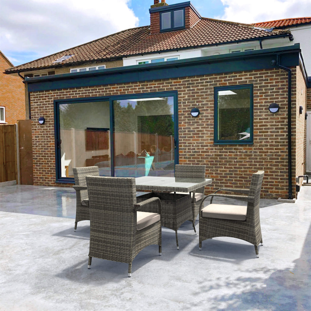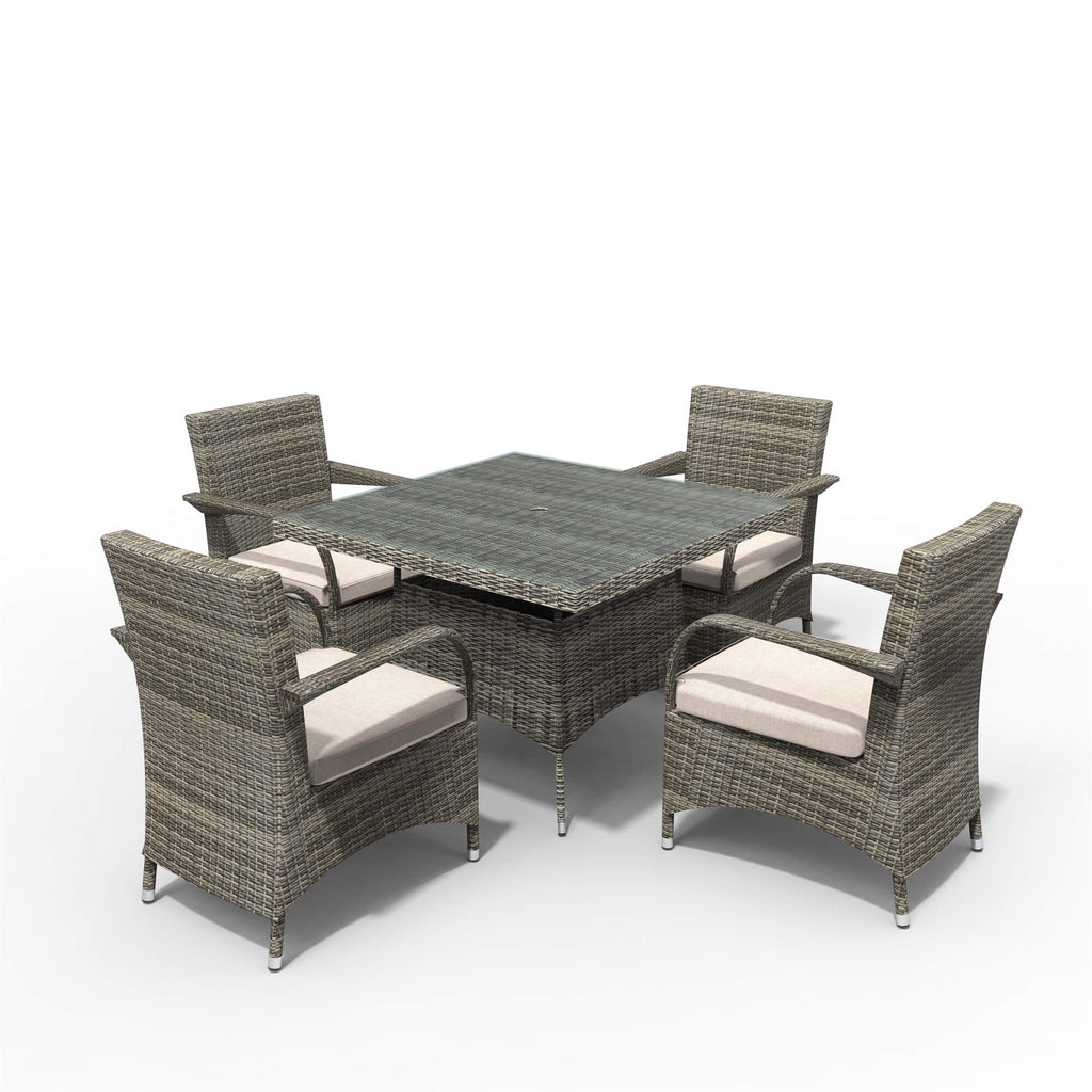 Upgrade your outdoor space with this 4-seater square aluminum PE wicker dining set, built for style, comfort, and durability. Handwoven from eco-friendly, all-weather PE wicker over a rustproof aluminum frame, it resists corrosion, UV rays, insects, and mold.
