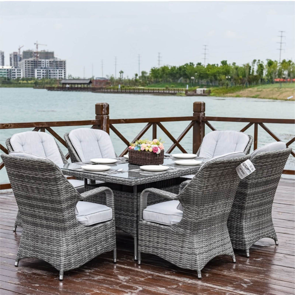 Elevate your outdoor dining experience with this stylish and durable Aluminum Dining Table Set. Featuring an elegant design, this set includes a spacious dining table and six comfortable chairs, perfect for family gatherings or entertaining guests. The high-quality PE cane and rust-resistant aluminum frame ensure long-lasting performance, while the tempered glass tabletop is easy to maintain. With the added convenience of an umbrella hole for shade, this set is a perfect addition to your patio, garden, or balcony.