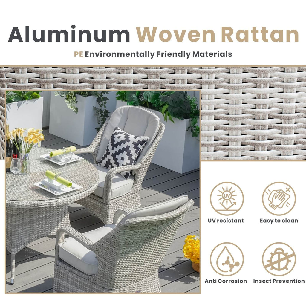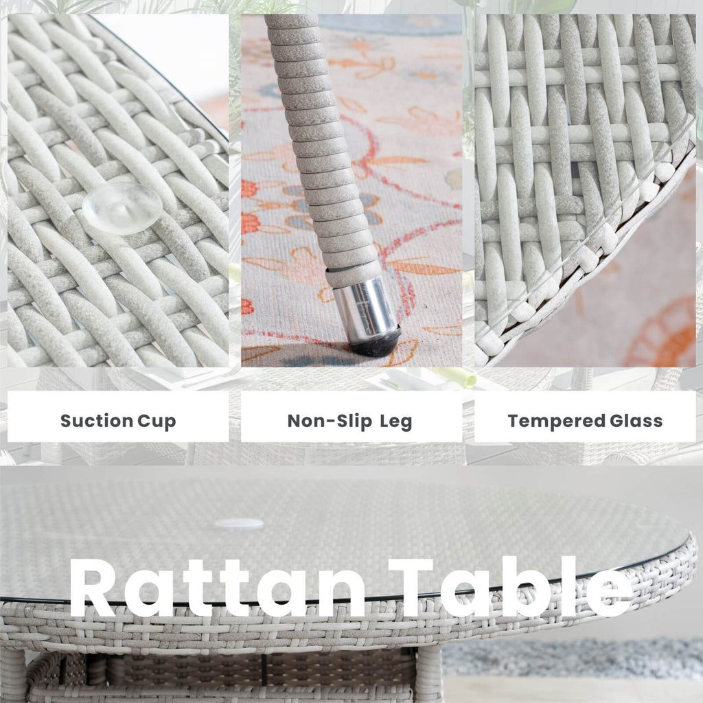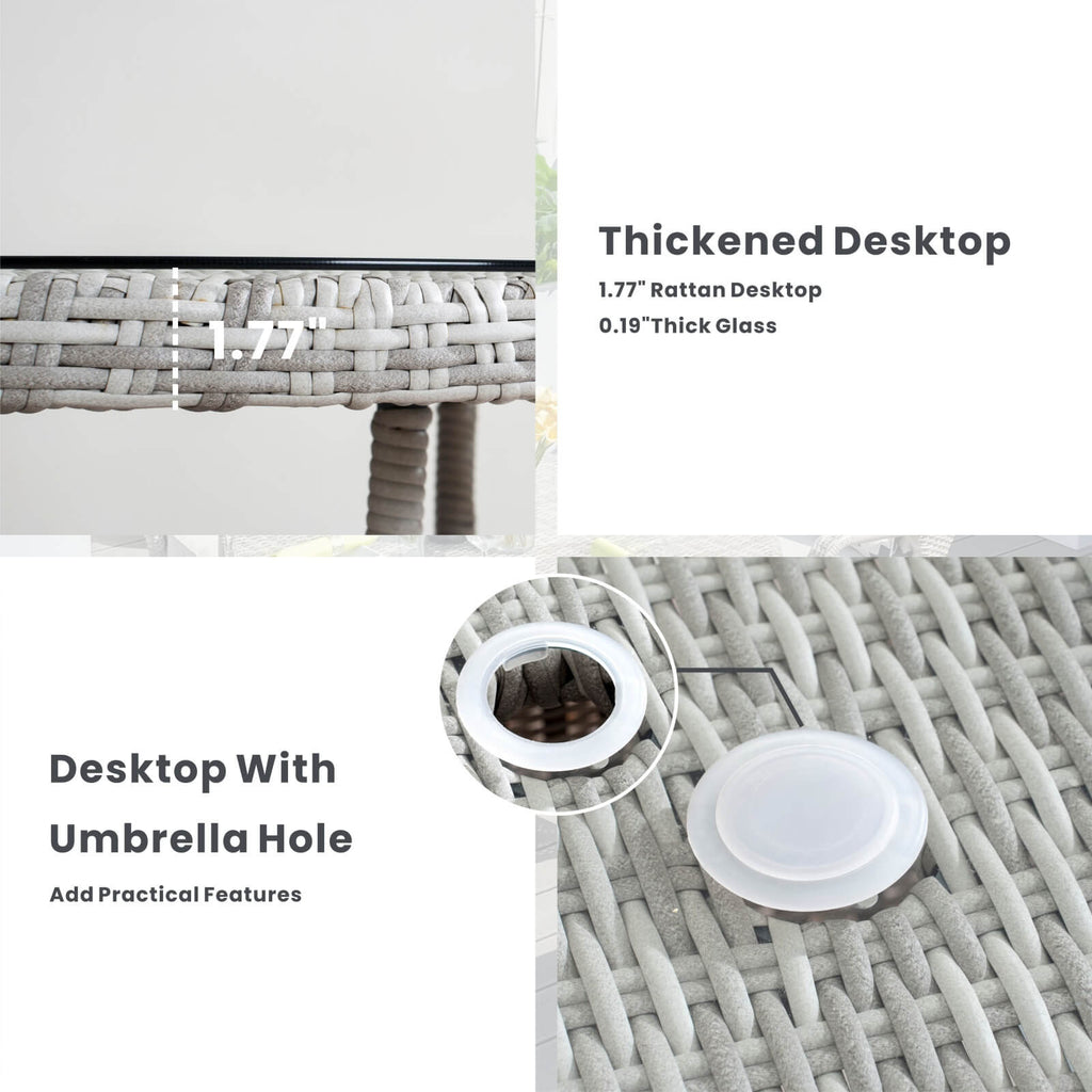 - Materials: PE Wicker, Aluminum Frame, 5mm Tempered Glass